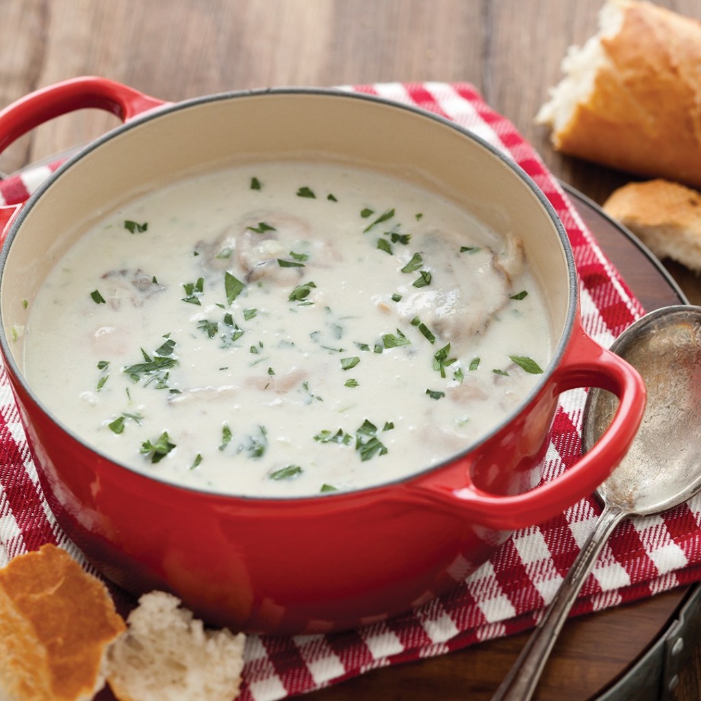 Add the oysters and simmer until they’re plump and firm and their gills curl, about 5 minutes, taking care not to overcook them. Taste and adjust the salt and pepper and serve at once, making sure that a great portion of oysters and butter makes it into each bowl.